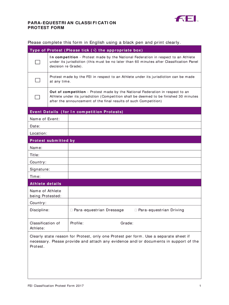 Athletes or representatives of athletes who believe there is an issue with their classification are required to file the para-equestrian classification protest form.