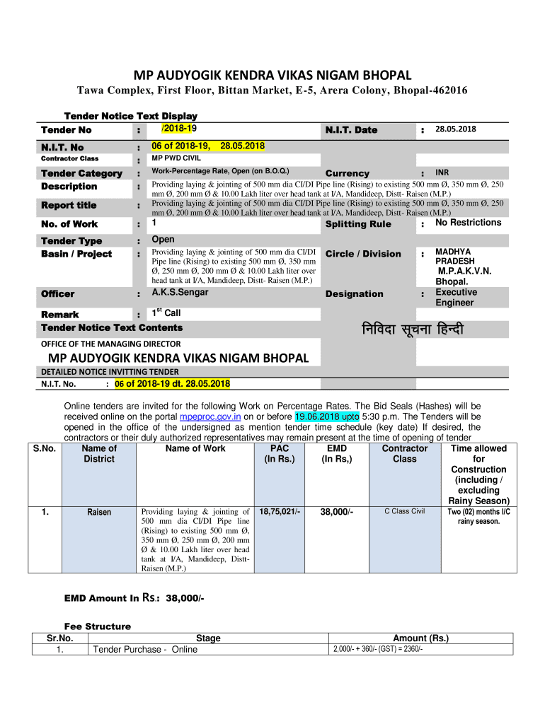 MP AUDYOGIK KENDRA VIKAS NI GAM BHOPAL Taxa Complex, First Floor, Bitten Market, E5, Area Colony, Bhopal462016 Tender Notice Text Display Tender No : 16/201819 N.I.T. No Tender Category Description: