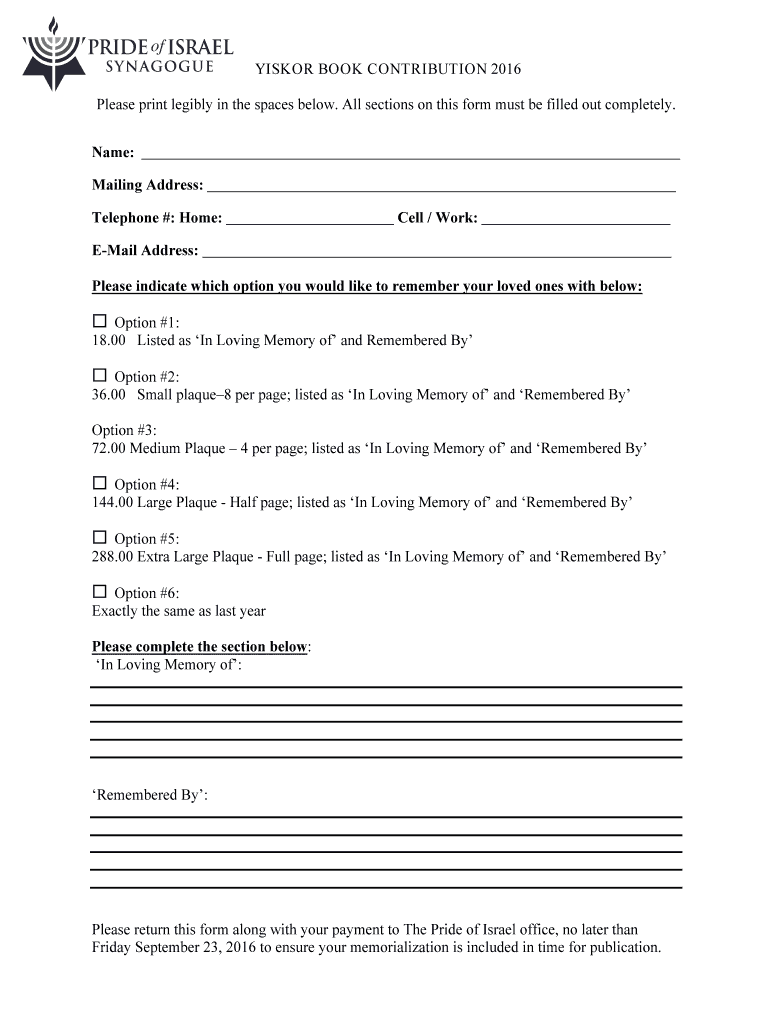 Remember, the process of filling out yizkor books in print can vary slightly depending on the specific book or guidelines provided. Make sure to read any accompanying instructions or consult with a knowledgeable person if you have any specific questions or concerns.
