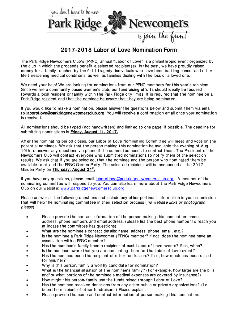 2 0 1 7 2 0 1 8 Labor of Love Nomination Form The Park Ridge Newcomers Clubs (PRC) annual Labor of Love is a philanthropic event organized by the clubs in which the proceeds beef it a select ed recipient