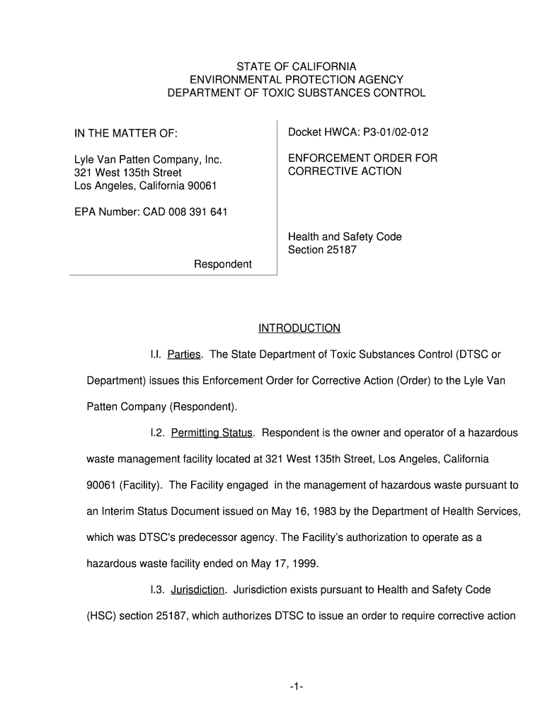 DEPARTMENT OF TOXIC SUBSTANCES CONTROL IN THE MATTER OF:Docket HCA: P301/02012Lyle Van Pattern Company, Inc.