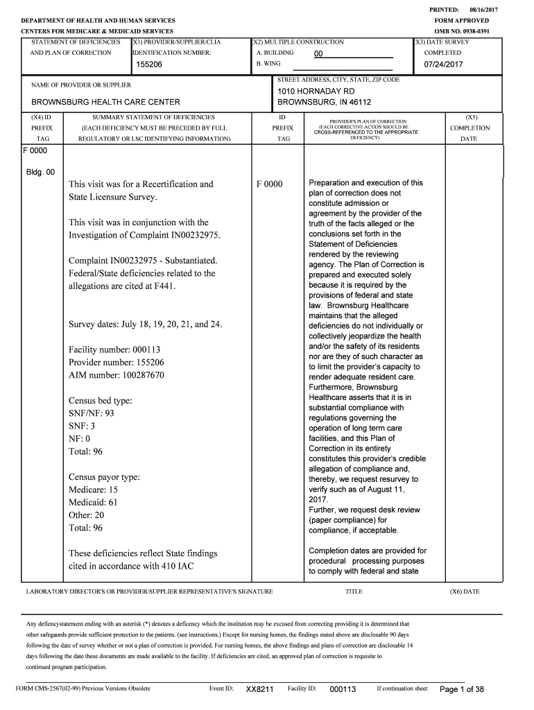 PRINTED: DEPARTMENT OF HEALTH AND HUMAN SERVICES CENTERS FOR MEDICARE & MEDICAID SERVICES STATEMENT OF DEFICIENCIES(X1) PROVIDER/SUPPLIER/LIGAND PLAN OF CORRECTIONIDENTIFICATION NUMBER:15520608/16/2017FORM