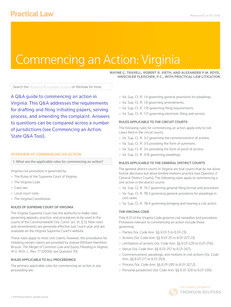 Resource ID: w0173266Commencing an Action: Virginia WAYNE G. TRAVEL, ROBERT R. KIETH, AND ALEXANDER P.M. BOYD, FISCHER FLEISCHER, P.C., WITH PRACTICAL LAW LITIGATIONSearch the Resource ID numbers