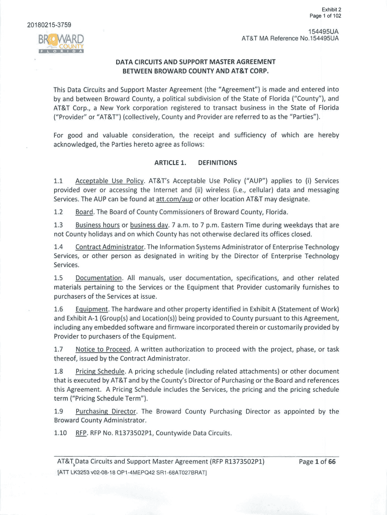 Exhibit 2-Page 1 of 102201802153759 154495UA AT&T MA Reference No .154495UA.......BR WARD 01, DATA CIRCUITS AND SUPPORT MASTER AGREEMENT BETWEEN BROWARD COUNTY AND AT&T CORP. This Data Circuits and