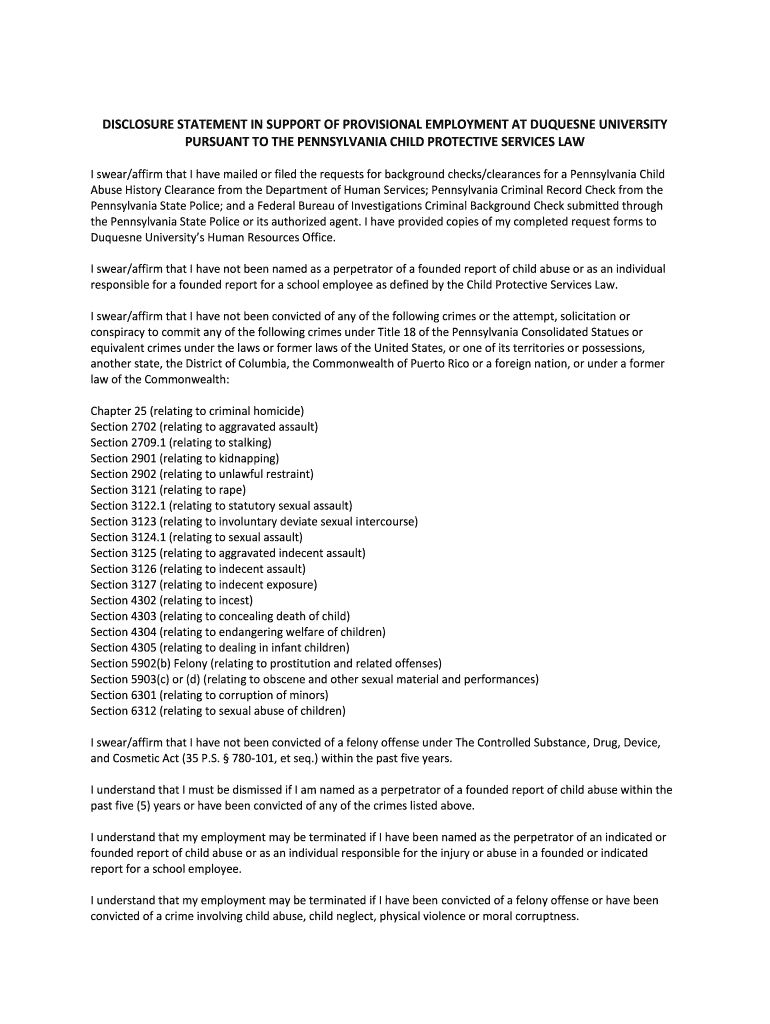 DISCLOSURE STATEMENT IN SUPPORT OF PROVISIONAL EMPLOYMENT AT DUQUESNE UNIVERSITY