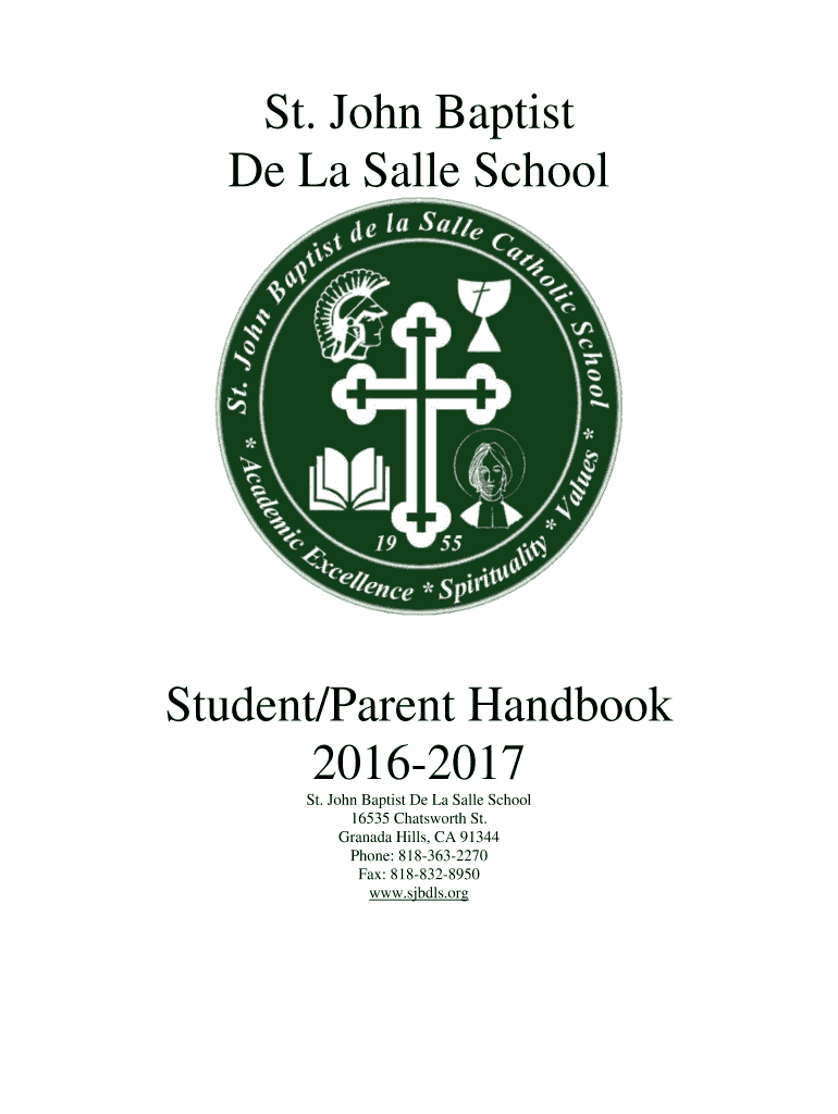 St. John Baptist De La Sale SchoolStudent/Parent Handbook 20162017 St. John Baptist De La Sale School 16535 Chats worth St. Granada Hills, CA 91344 Phone: 8183632270 Fax: 8188328950 www.sjbdls.orgTable