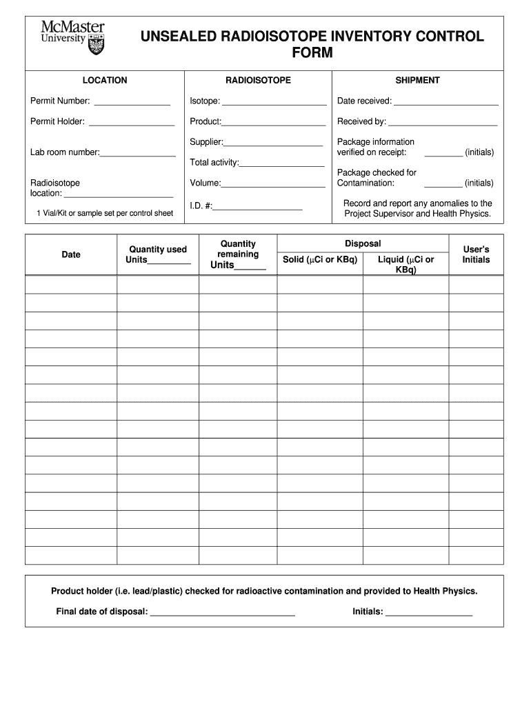 UNSEALED RADIOISOTOPE INVENTORY CONTROL FORM LOCATIONRADIOISOTOPESHIPMENTPermit Number: Isotope: Date received: Permit Holder: Product: Received by: Supplier: Package information verified on receipt:Lab
