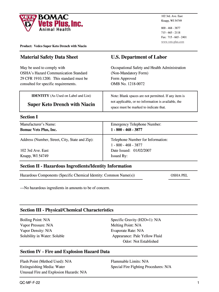 102 3rd. Ave. East Knapp, WI 54749 800 468 3877 715 665 2118 Fax: 715 665 2401 www.vetsplus.comProduct: Video Super Keto Drench with NiacinMaterial Safety Data Sheet. S. Department of Labor May be
