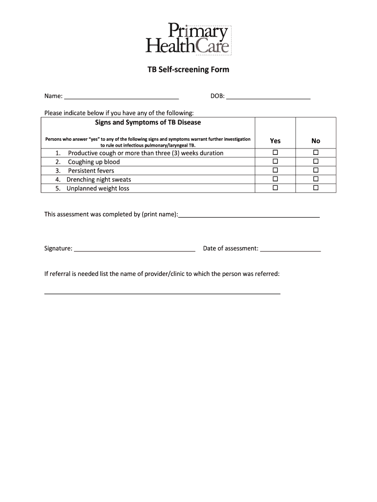 TB Self screening Form Name: DOB: Please indicate below if you have any of the following:Signs and Symptoms of TB Disease Persons who answer yes to any of the following signs and symptoms warrant