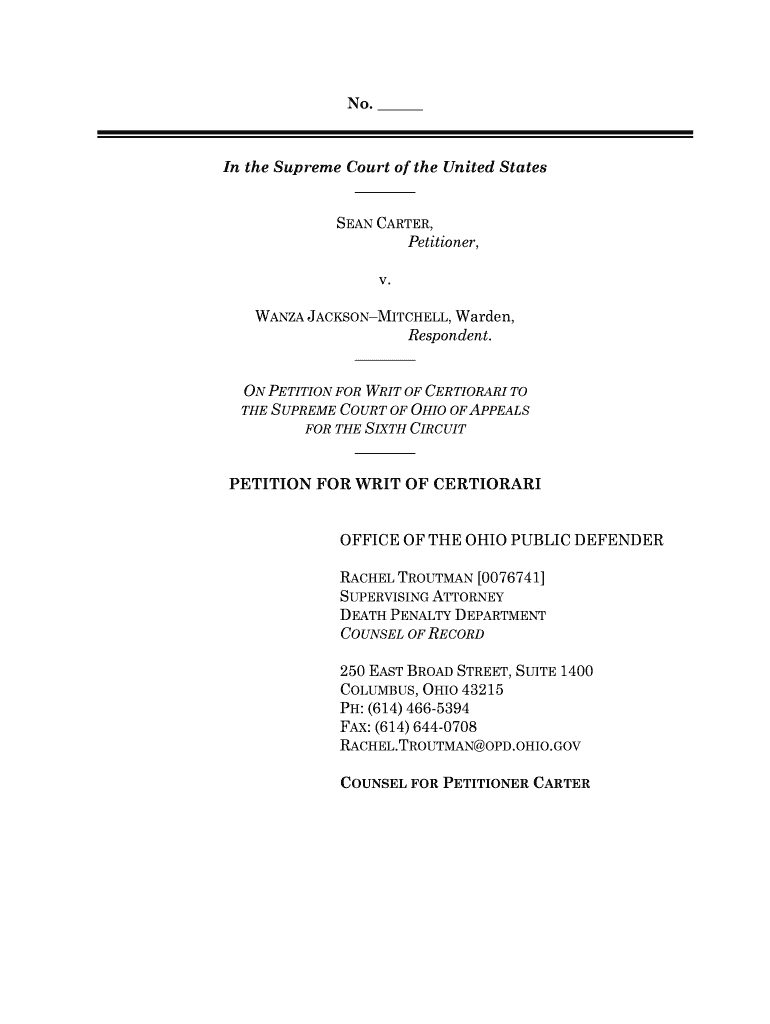 No. In the Supreme Court of the United States SEAN CARTER, Petitioner, v. WANNA JACKSONMITCHELL, Warden, Respondent. ON PETITION FOR WRIT OF CERTIORARI TO THE SUPREME COURT OF OHIO OF APPEALS FOR