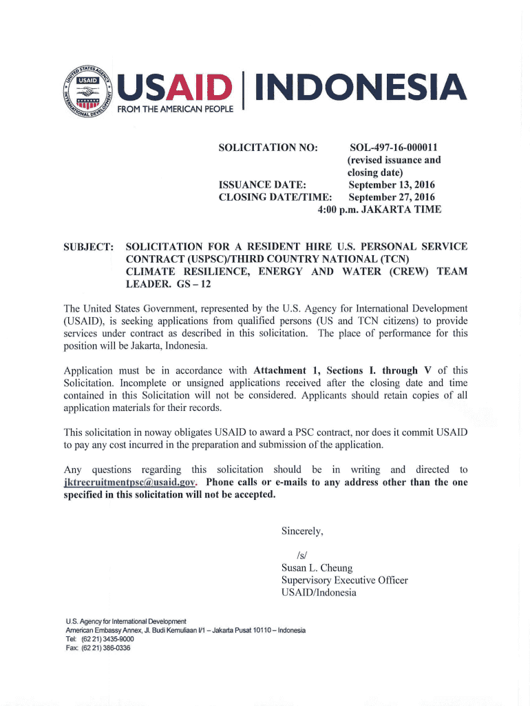 USAID INDONESIA FROM THE AMERICAN PEOPLESOLICITATI ON NO:SO L49716000011 (revised issuance and closing date) ISSUANCE DATE: September 13, 2016, CLOSING DATE/TIME: September 27, 2016 4:00 p.m. JAKARTA