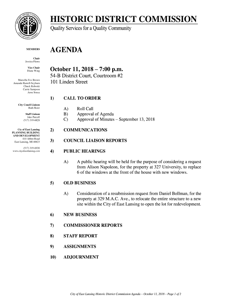 HISTORIC DISTRICT COMMISSIONMEMBERSAGENDAChair Jessica Flores Vice Chair Diane Wing Marcella Fox Brown Amanda HarrellSeyburn Chuck Robot Carrie Sampson Aron Sousa October 11, 2018 7:00 p.m. 54B District