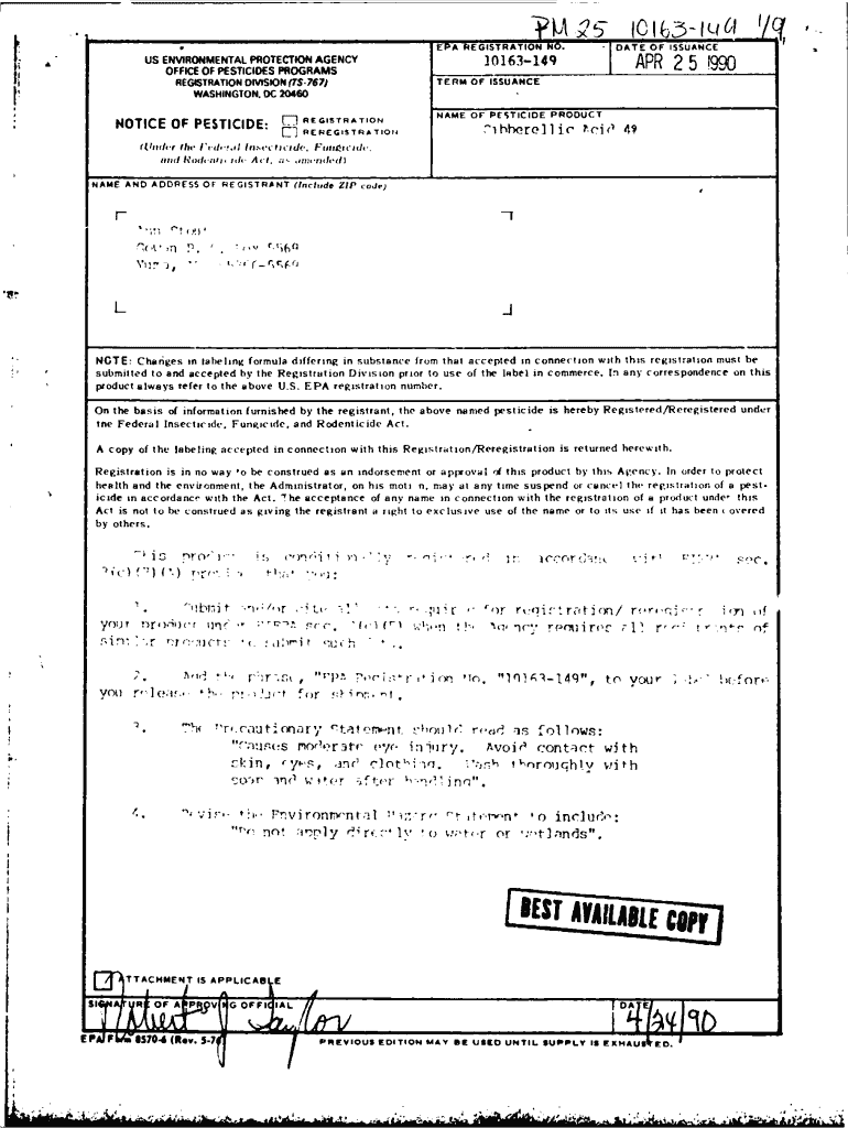 15IClb3ll161 '/g, EPA REGISTRATION NO.us ENVIRONMENTAL PROTECTION AGENCYOATE OF ISSUANCE APR 25 1990l016314QOFFICE OF PESTICIDES PROGRAMS REGISTRATION OPTION (TS,7671TERM OF ISSUANCEWASHINGTON, DC