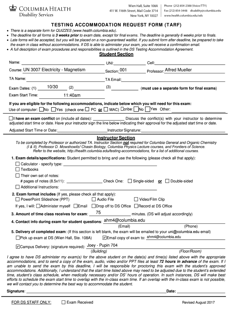 TESTING ACCOMMODATION REQUEST FORM (TURF) There is a separate form for QUIZZES (www.health.columbia.edu). The deadline for all forms is 3 weeks prior to exam date, except for final exams. The deadline