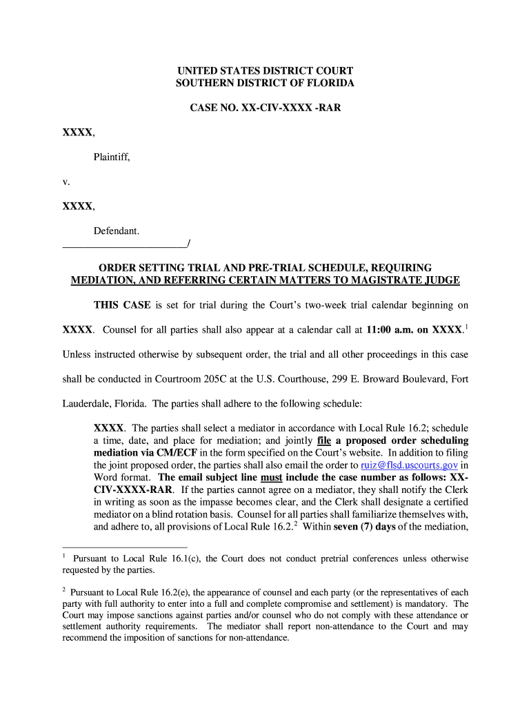 UNITED STATES DISTRICT COURT SOUTHERN DISTRICT OF FLORIDA CASE NO. XXCIVXXXX RAR XXX, Plaintiff, v. XXX, Defendant. / ORDER SETTING TRIAL AND PRETRIAL SCHEDULE, REQUIRING MEDIATION, AND REFERRING
