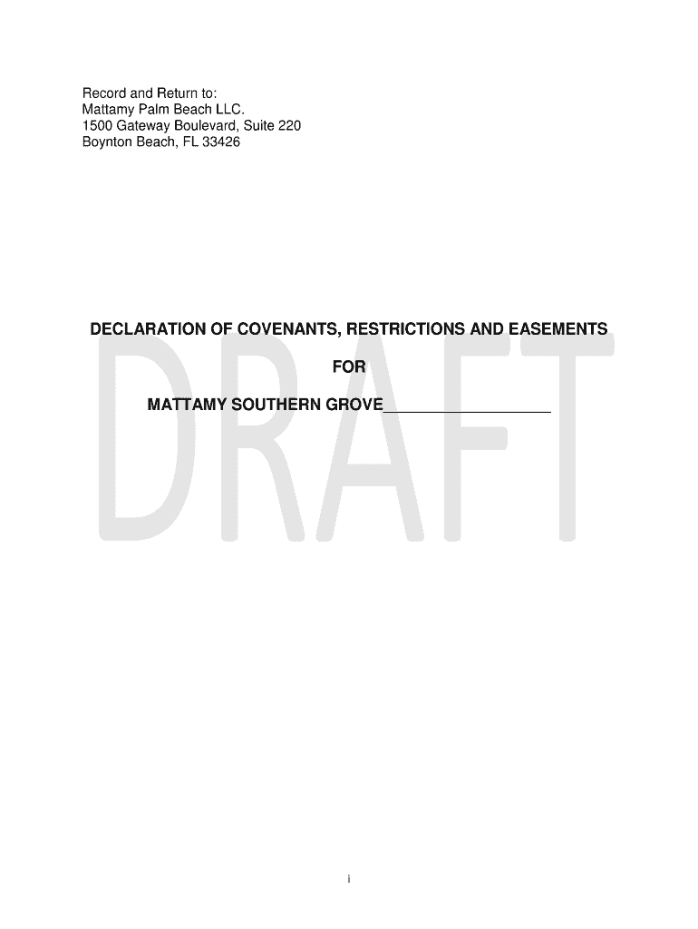 Record and Return to: Mattify Palm Beach LLC. 1500 Gateway Boulevard, Suite 220 Boynton Beach, FL 33426DECLARATION OF COVENANTS, RESTRICTIONS AND EASEMENTS FOR MATTIFY SOUTHERN GROVE table OF CONTENTS