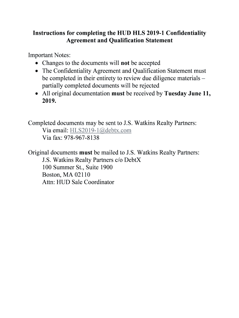Instructions for completing the HUD HLS 20191 Confidentiality Agreement and Qualification Statement Important Notes: Changes to the documents will not be accepted The Confidentiality Agreement and