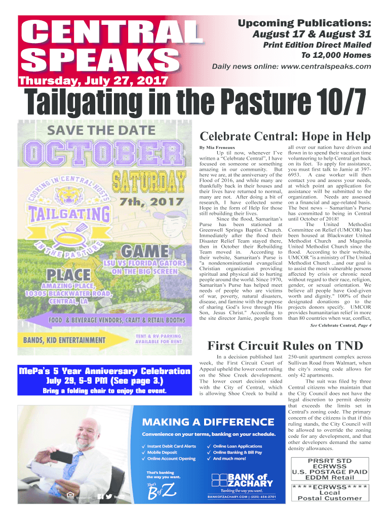 CENTRAL SPEAKS Thursday, July 27, 2017Upcoming Publications: August 17 & August 31Print Edition Direct Mailed To 12,000 Domesday news online: www.centralspeaks.comTailgating in the Pasture 10/7 Celebrate