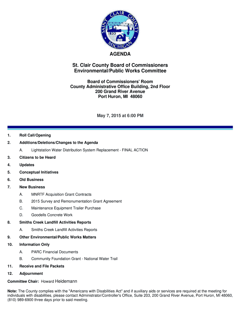 AGENDA St. Clair County Board of Commissioners Environmental/Public Works Committee Board of Commissioners Room County Administrative Office Building, 2nd Floor 200 Grand River Avenue Port Huron,
