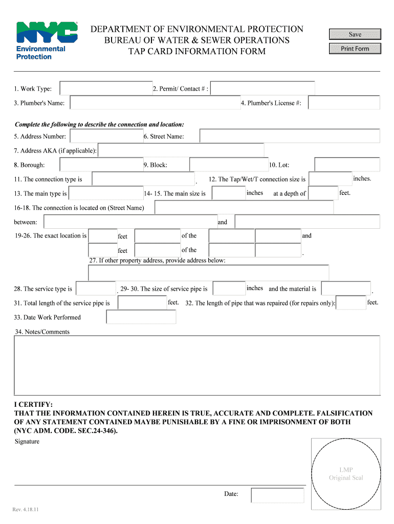 The Tap Card Information Form is a government document used by plumbers in New York to provide essential details for water and sewer connections.