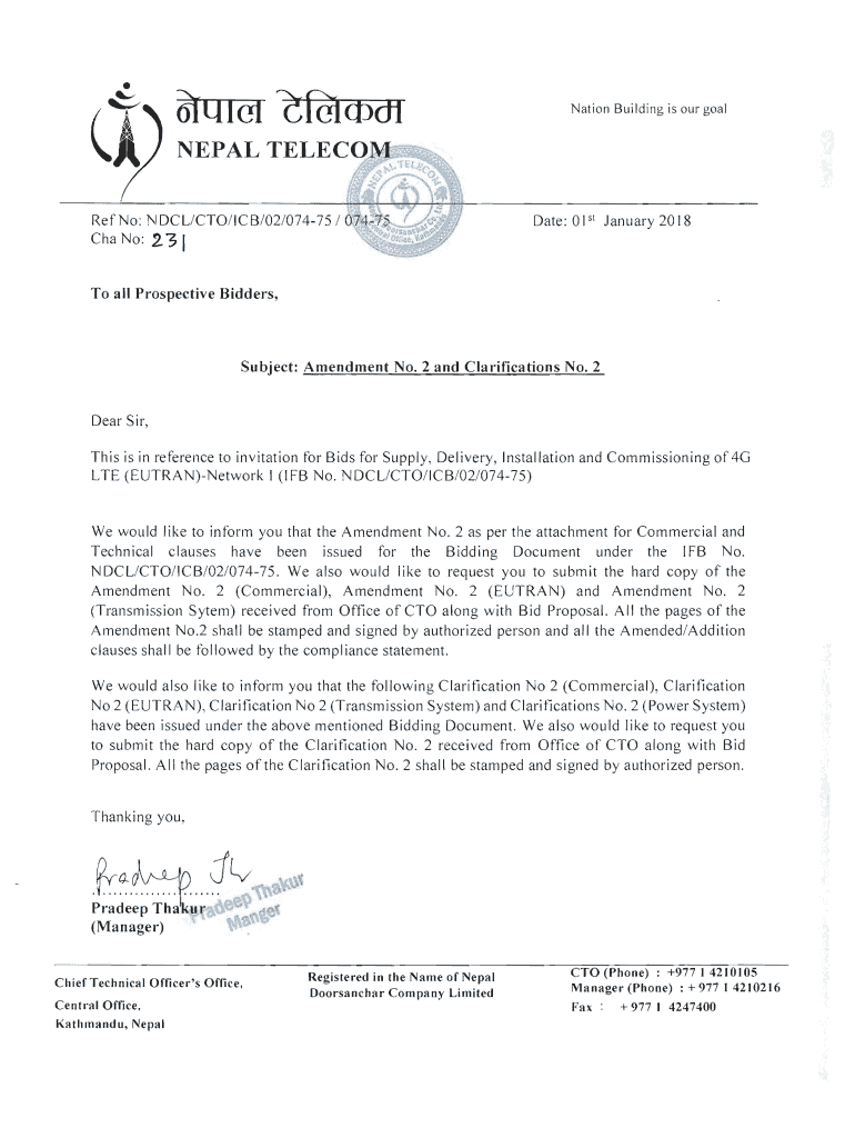 CIA No: 2. 31Date: 0 CSI January 2018To all Prospective Bidders, Subject: Amendment No.2 and Clarifications No.2Dear Sir,