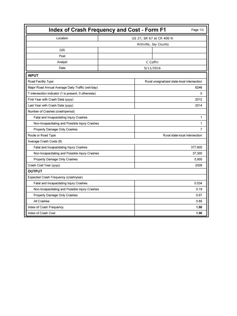 Index of Crash Frequency and Cost Form F1 Location Page 1/1US 27, SR 67 at CR 400 N Knoxville, Jay County GIS Post Analyst CoffinDate5/11/2016INPUT Road Facility Perusal signalized state local intersection