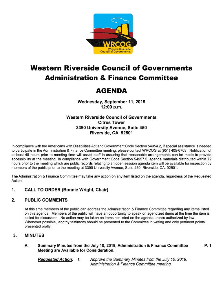 Western Riverside Council of Governments Administration & Finance Committee AGENDA Wednesday, September 11, 2019 12:00 p.m. Western Riverside Council of Governments Citrus Tower 3390 University Avenue,