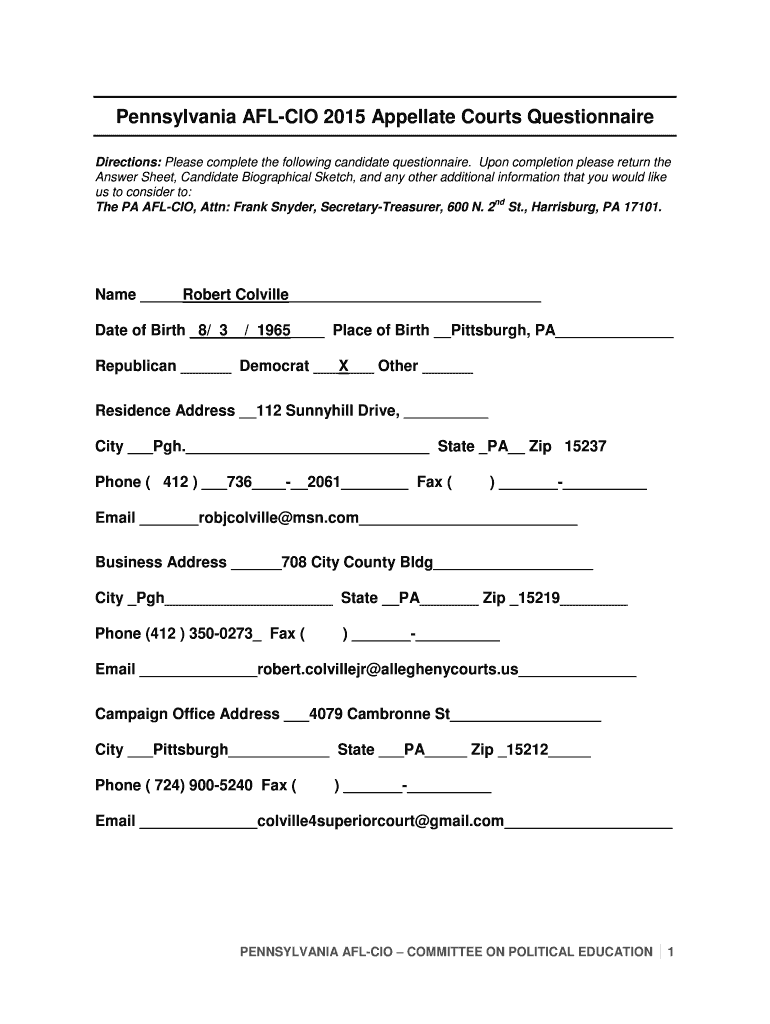 Pennsylvania AFL CIO 2015 Appellate Courts Questionnaire Directions: Please complete the following candidate questionnaire. Upon completion please return the Answer Sheet, Candidate Biographical Sketch,