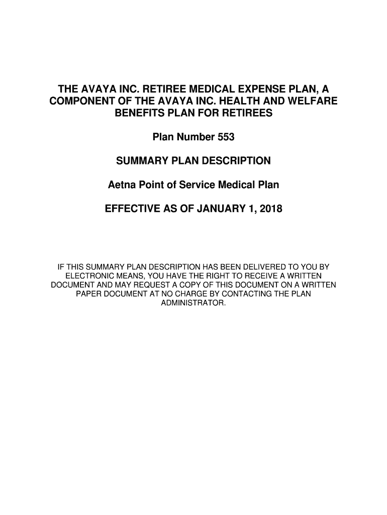 THE AVAYA INC. RETIREE MEDICAL EXPENSE PLAN, A COMPONENT OF THE AVAYA INC. HEALTH AND WELFARE BENEFITS PLAN FOR RETIREES Plan Number 553 SUMMARY PLAN DESCRIPTION Aetna Point of Service Medical Plan