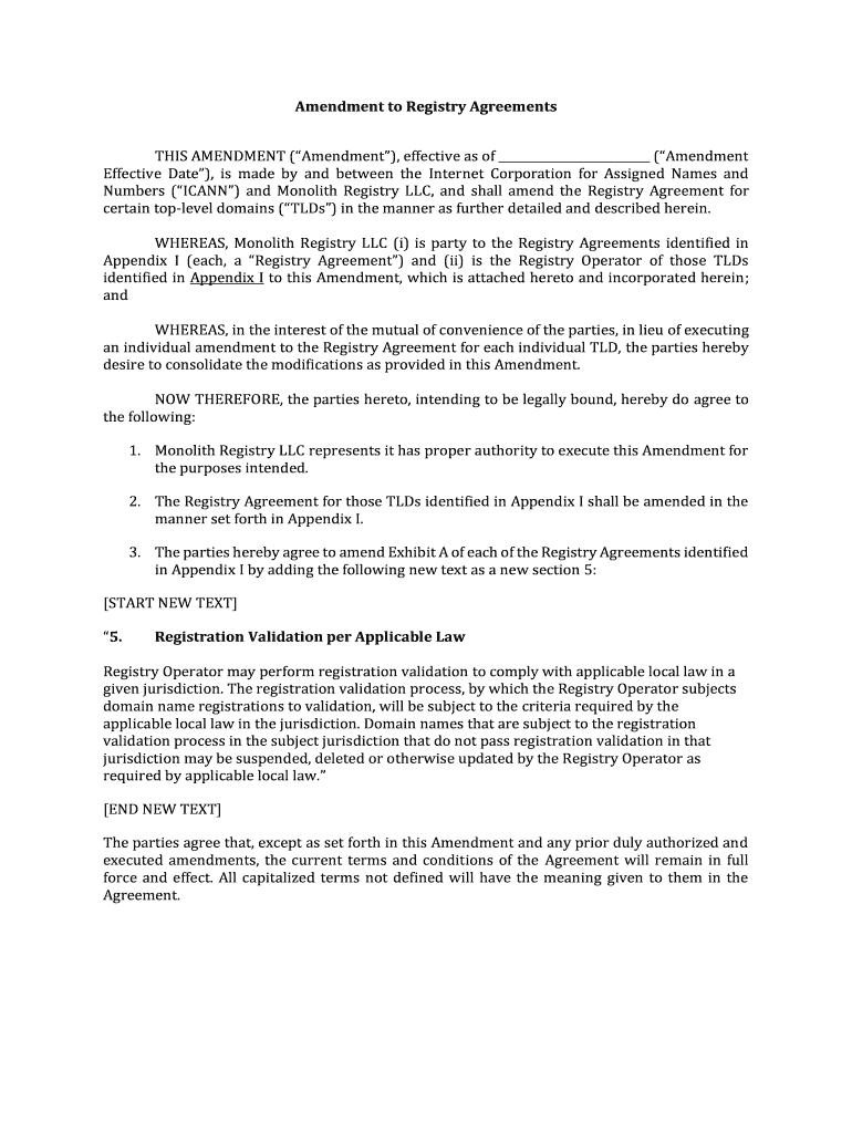 Get the free Numbers (ICANN) and Monolith Registry LLC, and shall amend the Registry Agreement for