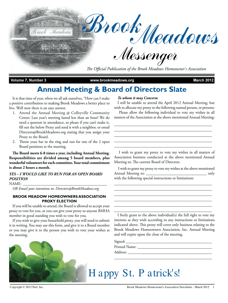 Brook Meadows Official Publication of the Brook Meadows Homeowner's AssociationVolume 7, Number 3www. Brook meadows.org March 2012Annual Meeting & Board of Directors Slate It is that time of year,