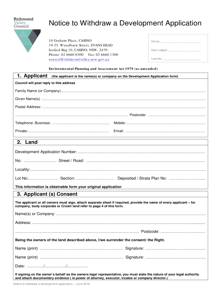Notice to Withdraw a Development Application 10 Graham Place, CASINO 1925 Woodburn Street, EVANS HEAD Locked Bag 10, CASINO, NSW, 2470 Phones: 02 6660 0300 Fax: 02 6660 1300 council richmondvalley.NSW.gov.