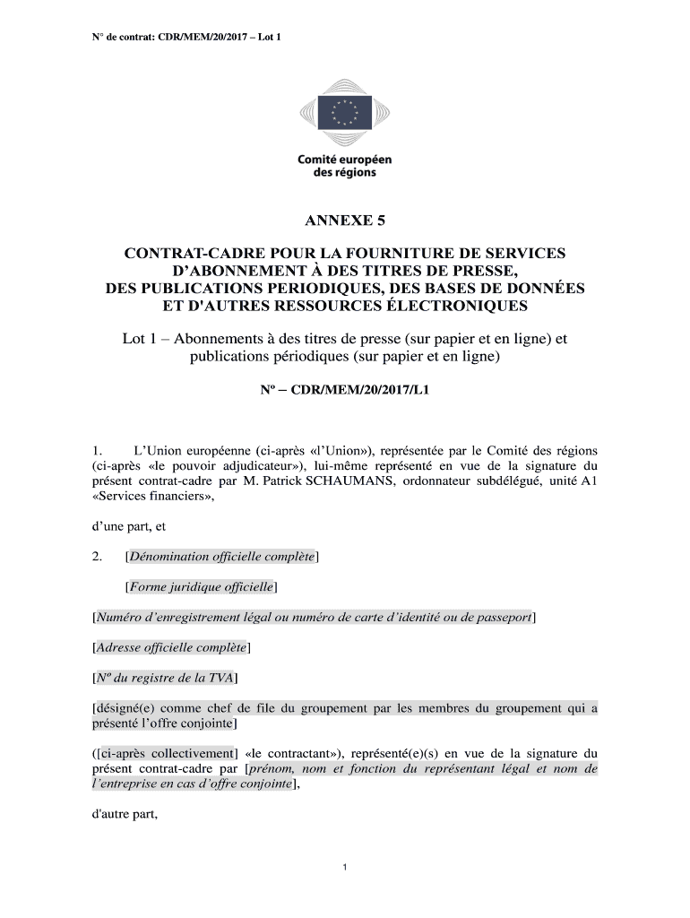 N de contract: CDR/ME/20/2017 Lot 1ANNEXE 5 CONTRACTURE POUR LA FURNITURE DE SERVICES ATONEMENT DES TITLES DE PRESS, DES PUBLICATIONS PERIODICALS, DES BASES DE DONNE SET D 'AUT RES RESOURCES LECTRONIQUES