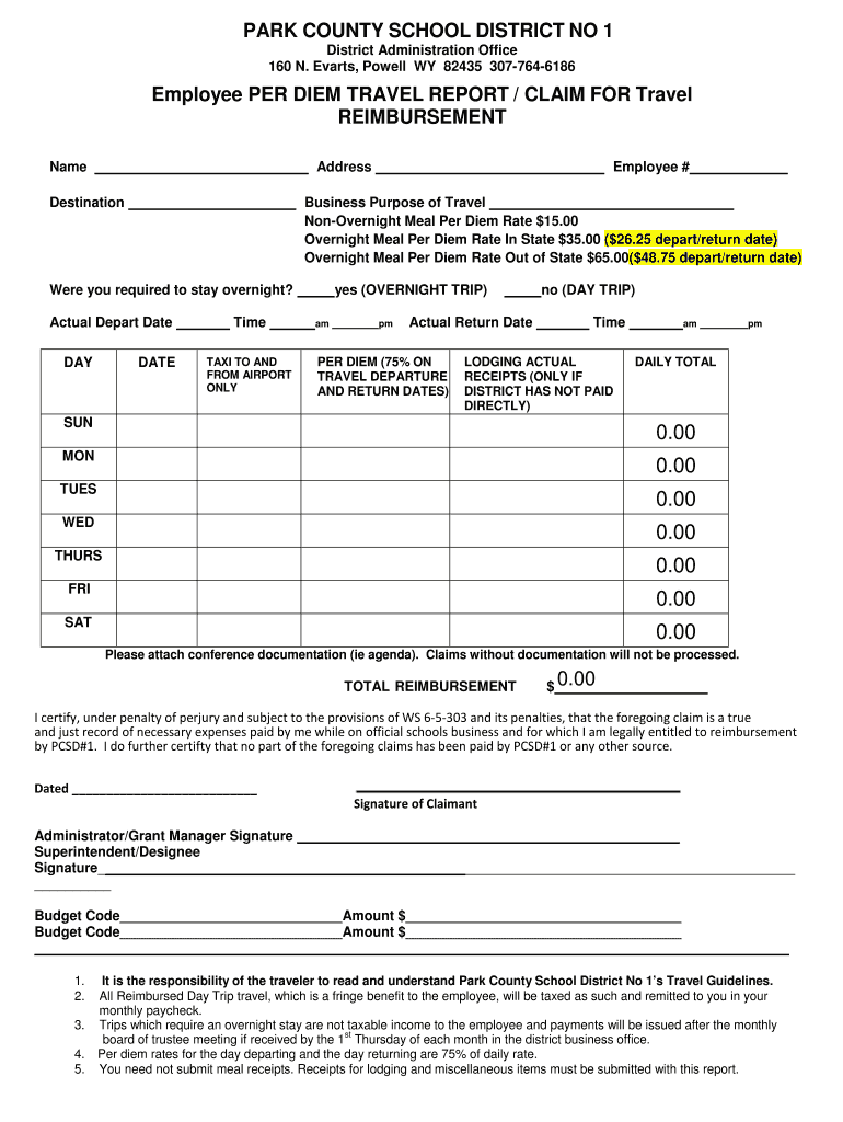 PARK COUNTY SCHOOL DISTRICT NO 1 District Administration Office 160 N. Events, Powell WY 82435 3077646186Employee PER DIEM TRAVEL REPORT / CLAIM FOR Travel REIMBURSEMENT NameAddressDestinationBusiness