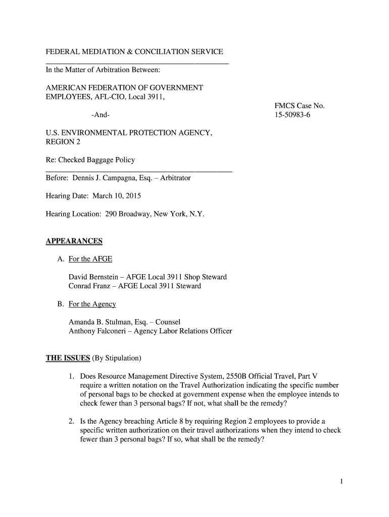 FEDERAL MEDIATION & CONCILIATION SERVICE In the Matter of Arbitration Between: AMERICAN FEDERATION OF GOVERNMENT EMPLOYEES, AFL CIO, Local 3911, Adams Case No. 15509836U. S. ENVIRONMENTAL PROTECTION