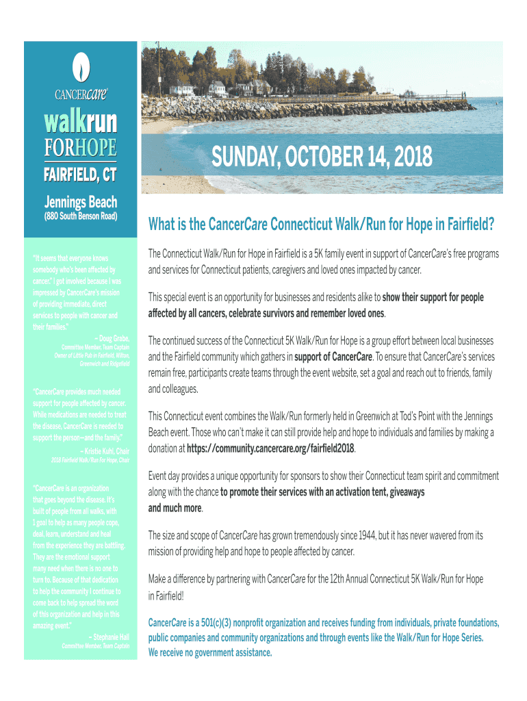 SUNDAY, OCTOBER 14, 2018, Jennings Beach(880 South Benson Road)It seems that everyone knows somebody who's been affected by cancer. I got involved because I was impressed by Chanceries' mission of