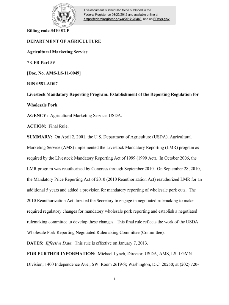 This document is scheduled to be published in the Federal Register on 08/22/2012 and available online at http://federalregister.gov/a/201220443, and on Days. Billing code 341002 P DEPARTMENT OF AGRICULTURE