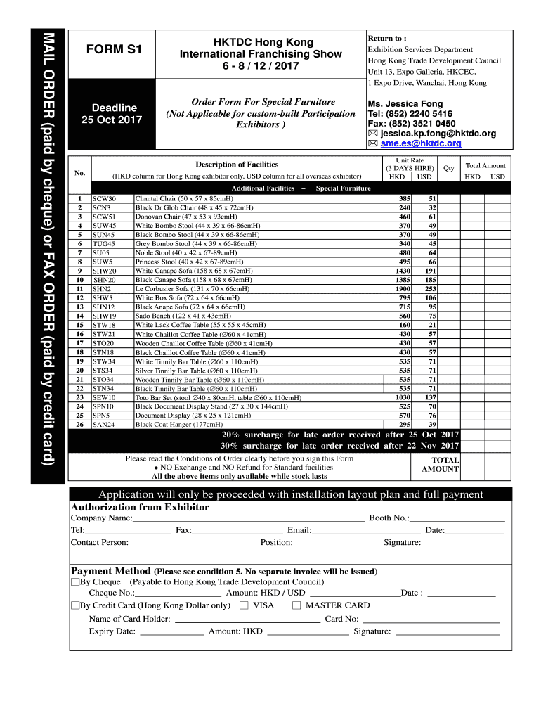 MAIL ORDER (paid by check) or FAX ORDER (paid by credit card)FORM S1HKTDC Hong Kong International Franchising Show 6 8 / 12 / 2017Return to : Exhibition Services Department Hong Kong Trade Development