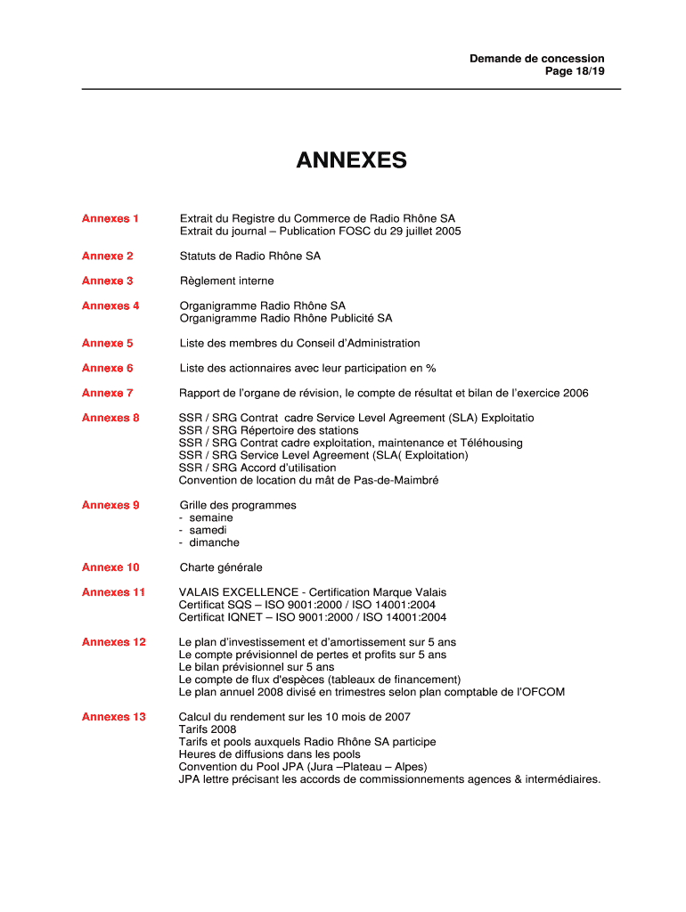 Demand DE concession Page 18/19ANNEXES Annexes 1Extrait Du Register du Commerce de Radio Rhine SA Extract Du journal Publication FQSC Du 29 bullet 2005Annexe 2Statuts de Radio Rhine Annexed 3Rglement