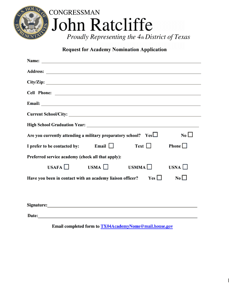 CONGRESSMAN John RatcliffeProudly Representing the 4th District of TexasRequest for Academy Nomination Application Name: Address: City/Zip: Cell Phone: Email: Current School/City: High School Graduation