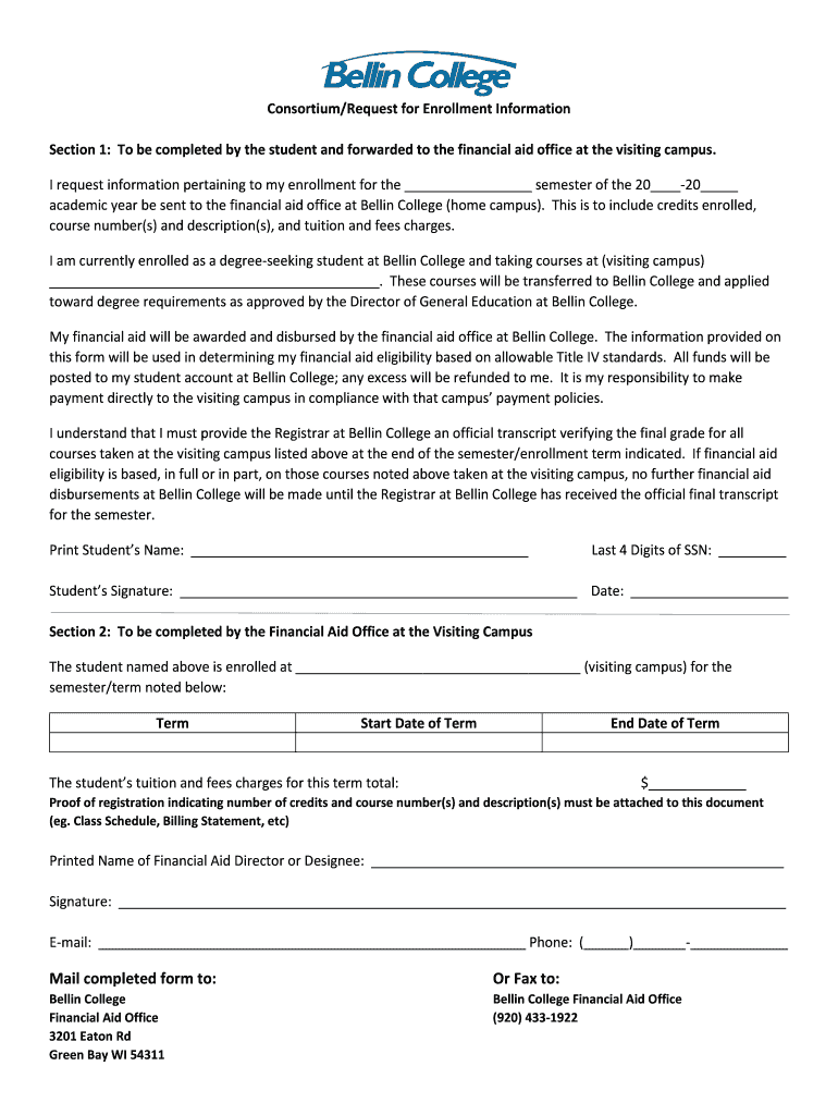 Consortium/Request for Enrollment Information Section 1: To be completed by the student and forwarded to the financial aid office at the visiting campus. I request information pertaining to my enrollment