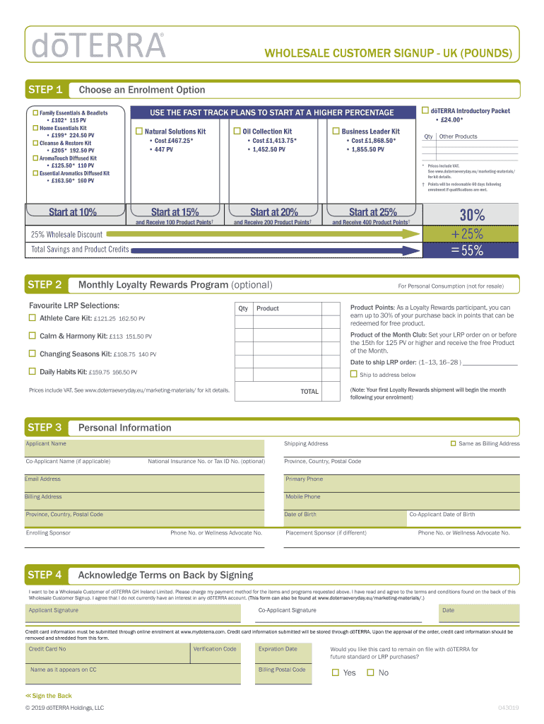 WHOLESALE CUSTOMER SIGN UP UK (POUNDS) STEP 1Choose an Enrollment Option USE THE FAST TRACK PLANS TO START AT A HIGHER PERCENTAGEFamily Essentials & Beadles 102× 115 PV Home Essentials Kit 199×
