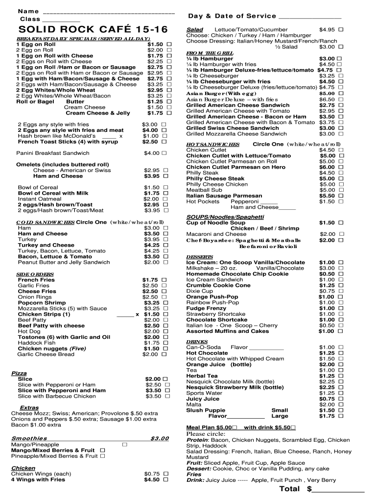 Name Class SOLID ROCK CAF 1516BREAKFAST DAILY SPECIALS (SERVED ALL DAY) 1 Egg on Roll $1.50 2 Egg on Roll $2.00 1 Egg on Roll with Cheese $1.75 2 Eggs on Roll with Cheese $2.25 1 Egg on Roll /Ham