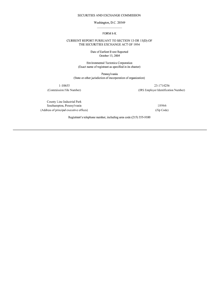 Get the free On October 13, 2004, Environmental Tectonics Corporation issued a press release anno...