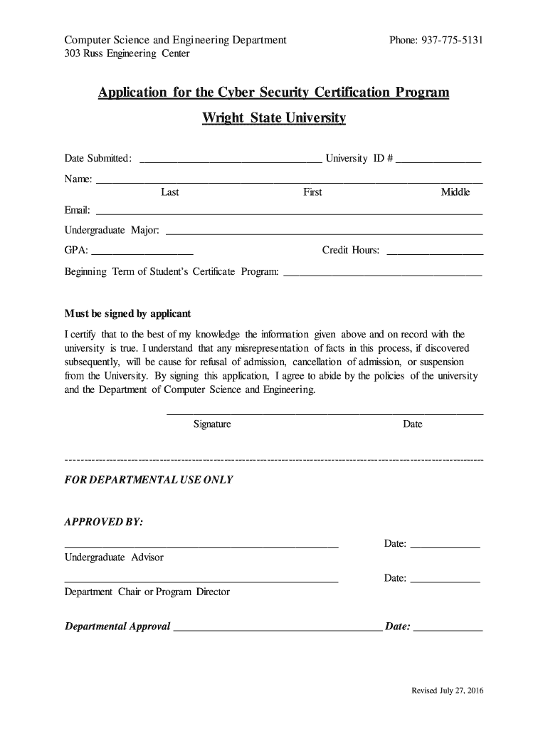 Computer Science and Engineering DepartmentPhone: 9377755131303 Russ Engineering CenterApplication for the Cybersecurity Certification Program Wright State University Date Submitted: University ID