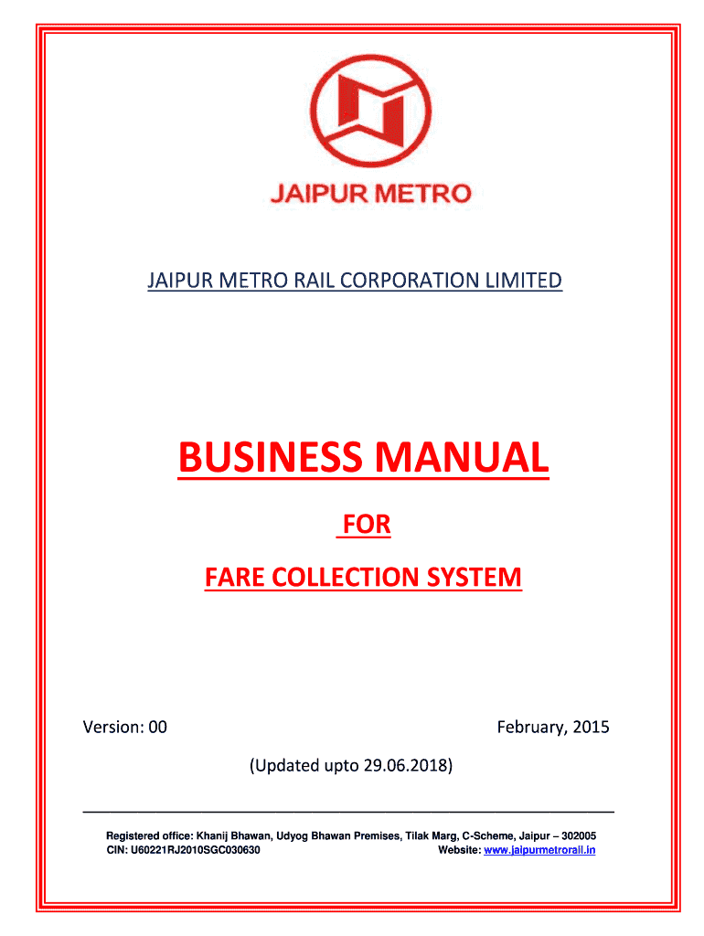 JAIPUR METRO RAIL CORPORATION LIMITEDBUSINESS MANUAL FOR FARE COLLECTION SYSTEMVersion: 00February, 2015 (Updated unto 29.06.2018) Registered office: Khan Shawn, Dog Shawn Premises, Talk Mary, Scheme,