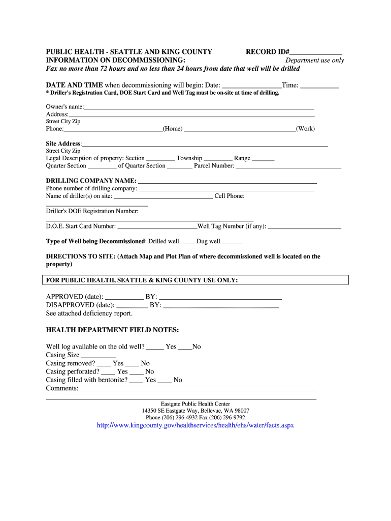 PUBLIC HEALTH SEATTLE AND KING COUNTY RECORD ID# INFORMATION ON DECOMMISSIONING: Department use only Fax no more than 72 hours and no less than 24 hours from date that well will be drilled DATE AND