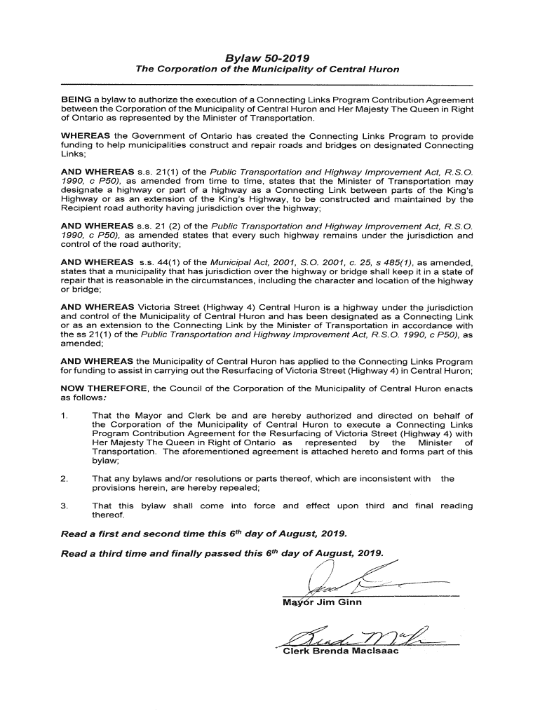 The Corporation of the Municipality of Central HuronBEING a bylaw to authorize the execution of a Connecting Links Program Contribution Agreement