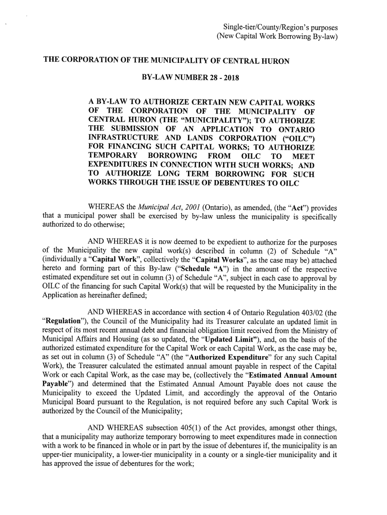 THE CORPORATION OF THE MUNICIPALITY OF CENTRAL HURONBYLAW NUMBER 28 2018