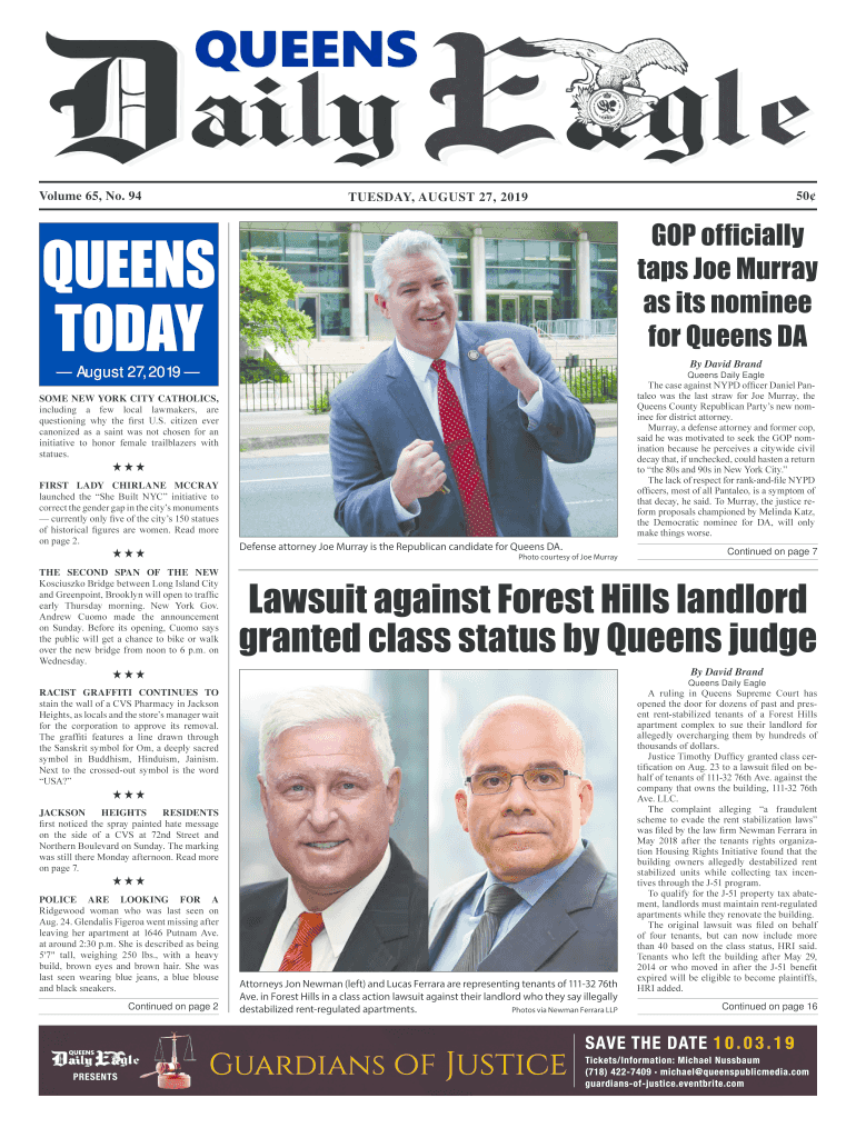 Volume 65, No. 9450Tuesday, August 27, 2019GOP officially taps Joe Murray as its nominee for Queens TODAY August 27, 2019, By David Brand Queens Daily Eagle The cases against NYPD officer Daniel Pantaloon